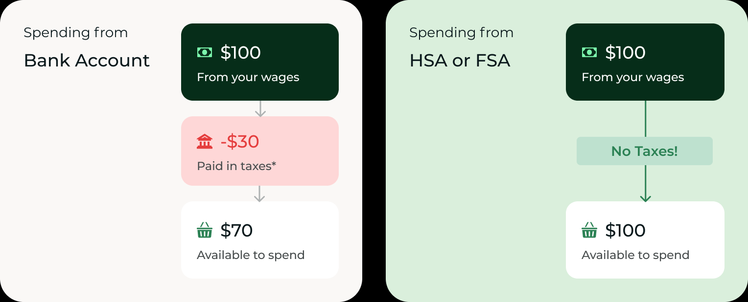 Because HSA/FSAs use pre-tax money, you’re getting more purchasing power for your dollars. Rather than pay taxes on income and then spend it on health items, qualified customers can use pre-tax funds to invest in root cause interventions.
